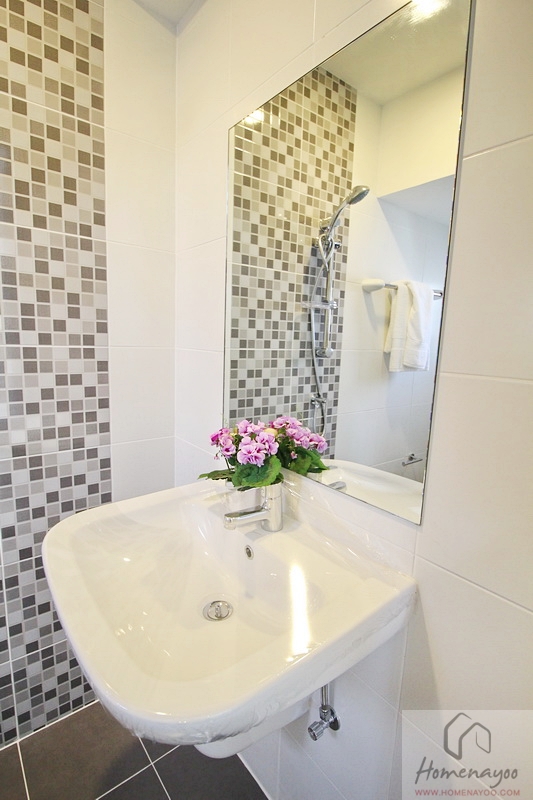 ติดกันนั้นเป็นส่วนอาบน้ำ ห้องนี้แยกโซนแห้งและเปียกด้วยพื้นที่มีขอบปูนกั้นขึ้นมา สามารถกันไม่ให้น้ำไหลออกมาโซนแห้งได้ แต่ถ้าจะให้ดีก็ติดตั้งฉากกั้นอาบน้ำ เพื่อกันน้ำกระเด็นเวลาอาบน้ำค่ะ