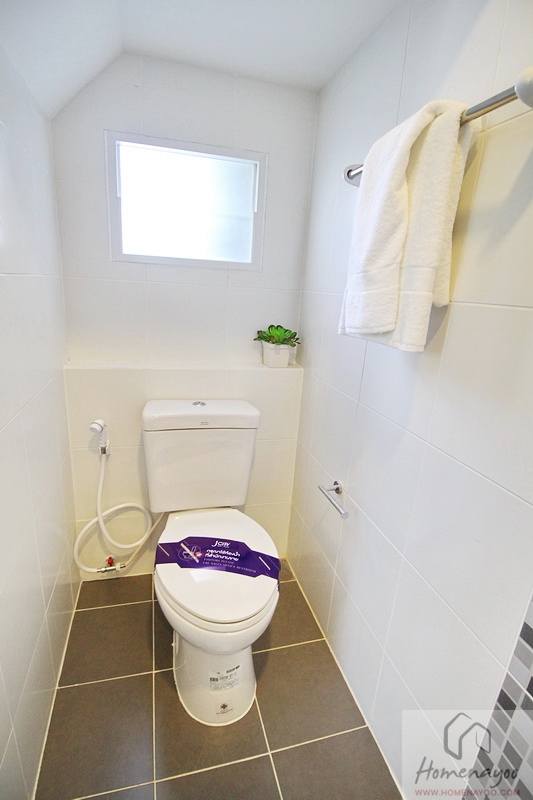 ภายในห้องน้ำจะมีหน้าต่างกระจกบานกระทุ้งเล็กๆทำให้ห้องสว่างและถ่ายเทอากาศได้ดี ด้านในแยกโซนแห้งและเปียกด้วยระดับพื้นห้องน้ำ