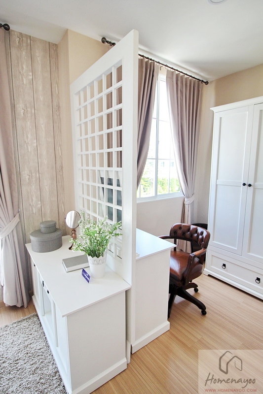 ปลายเตียงเป็ฯมุมแต่ตัว บ้านตัวอย่างได้ทำเป็นฉากกั้นขึ้นมาเป็นชั้นวางของ และชั้นวางทีวีตรงนี้ จะเห็นว่าฉากกั้นและชั้นเป็นตัวแบ่งพื้นที่ห้องทำให้ห้องดูเป็นสัดส่วน