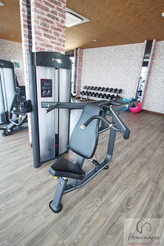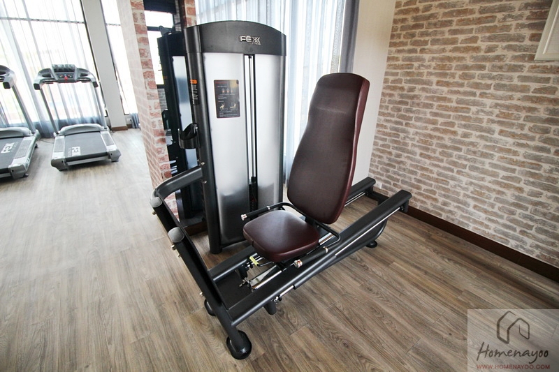 ชั้นบนเป็นฟิตเนส มีเครื่องเล่นหลากหลายและครบครัน ทั้งออกกำลังกายแบบคาดิโอ หรือจะเน้นเวทเทรนนิ่ง