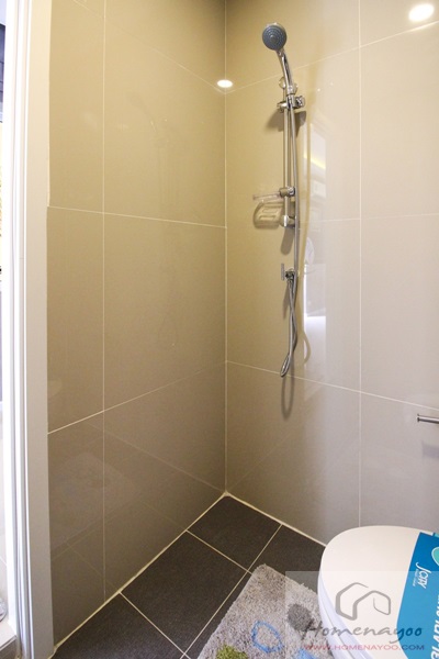 ในห้องนี้เราสามารถติดตั้งฉากกั้นอาบน้ำเพิ่มเติมได้นะคะ พื้นที่อาบน้ำเหลือประมาณ 90 x 90 ซม. เป็นขนาดกำลังดี