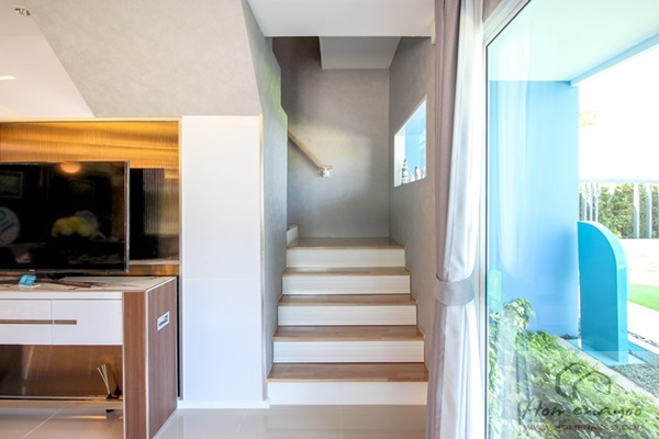 เสร็จจากชั้น 1 แล้วเราจะขึ้นไปดูที่ชั้น 2 ด้วยกันต่อเลย วัสดุบันได : ลูกนอนเป็นไม้ยางพาราอัดประสานทำสีธรรมชาติ ลูกตั้งเป็นผนังฉาบเรียบค่ะ