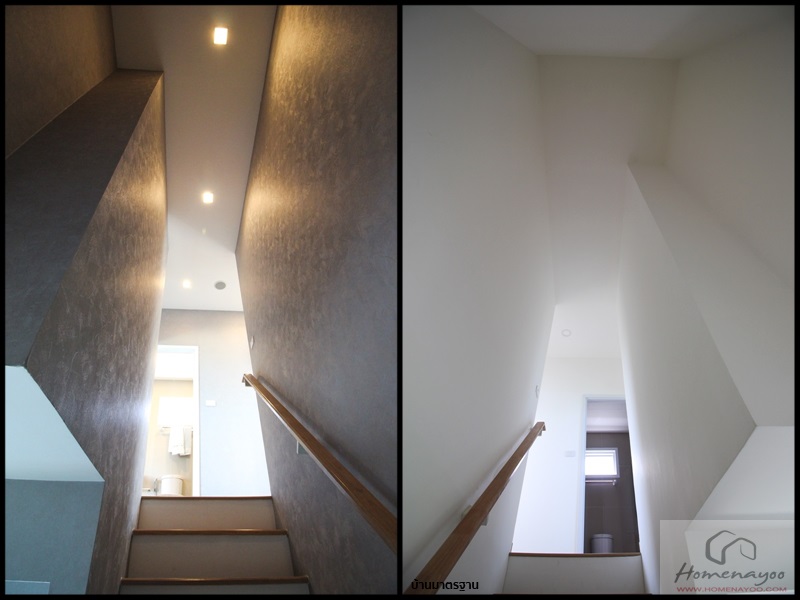ฝั่งซ้าย : ภาพมองย้อนกลับไปที่โถงบันได ฝั่งขวา : ขึ้นมาที่โถงบันไดชั้น 2 ที่พื้นจะปูด้วยไม้ลามิเนตหนา 8 มม.ดูอบอุ่น โถงบันไดจะเป็นตัวเชื่อมสู่ห้องนอนทุกห้อง ทางขวามือจะเป็นห้องนอนใหญ่ ตรงกลางโถงเป็นห้องน้ำชั้นบน ส่วนทางซ้ายมือเป็นห้องนอน 2 และ 3