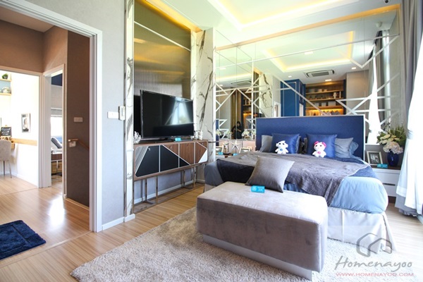 เริ่มจากโซนพักผ่อนกันก่อน ทางบ้านตัวอย่างวางเตียงขนาด 5 ฟุตมาให้ดูระยะการใช้งานค่ะ ยังมีที่เหลือพอสำหรับโต๊ะข้างทั้ง 2 ฝั่งเลยนะ