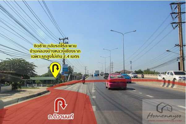 จุดกลับรถ สามารถกลับได้ตรงนี้เลยค่ะ ชิดซ้ายเข้าข้างสะพาน และกลับรถใต้สะพานข้ามคลองบางหลวงเชียงราก รถใหญ่อย่าง กระบะยกสูง Renger หรือ Pajero Sport ก็กลับได้นะคะ หรือจะตรงไปกลับอีกจุดนึงก็ได้ตามรูปด้านล่าง แต่ต้องสูงไม่เกิน 2.4 เมตรนะคะ