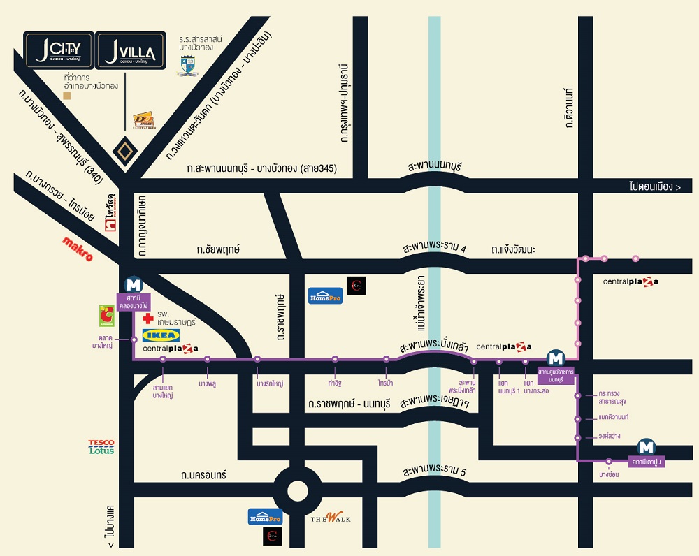 ♦ ทำเลที่ตั้งโครงการ : โครงการ J City วงแหวน-บางใหญ่ ตั้งอยู่ติดถนนใหญ่บางบัวทอง-สุพรรณบุรี ซึ่งเชื่อมต่อกับวงแหวนกาญจนาภิเษก, ถนนรัตนาธิเบศร์, ราชพฤกษ์ รอบๆโครงการในระยะเดินไม่ได้มีสิ่งอำนวยความสะดวกอะไรมาก แต่ใกล้ๆจะมี Tesco Lotus และ Makro อยู่ใกล้ๆในระยะขับรถประมาณ 8 นาทีถึง
