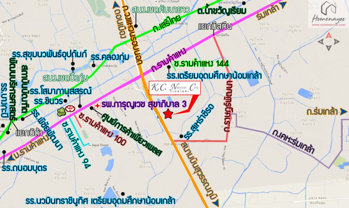 จากนั้นวิ่งตรงตาม ถนนรามคำแหง ตามป้ายไป บางนา, ชลบุรี ผ่านซ้ายมือ ซอยรามคำแหง 142 ทางเข้าโครงการ เค.ซี. เนเชอรัล วิลล์ รามคำแหง