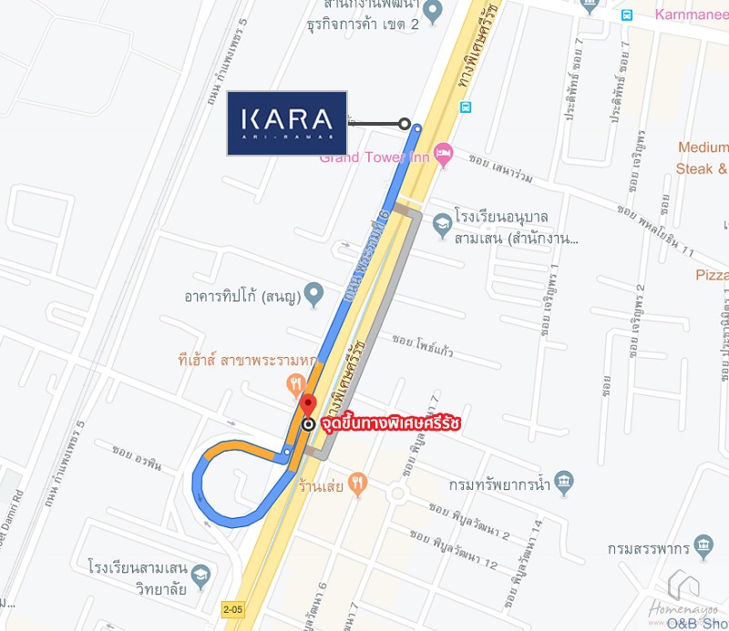 แผนที่จากทางโครงการ โครงการ KARA อารีย์ – พระราม 6 คอนโดแห่งเดียวบนถนนพระราม 6 เป็นโซนที่อยู่อาศัยที่ครบครันด้วยสิ่งอำนวยความสะดวก และเป็นศูนย์กลางของสำนักงานและธุรกิจไลฟ์สไตล์ร่วมสมัย เดินทางได้สะดวก เชื่อมต่อถนนสายหลักได้ง่าย และใกล้ทางพิเศษศรีรัช เพียง 2.1 ถึง MRT บางซื่อ และ 3 กม. ถึง BTS หมอชิต
