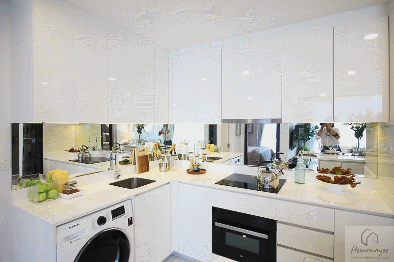 ส่วนเคาน์เตอร์ครัวใช้ Top หินสังเคราะห์สีขาว และติดตั้ง Back Splash ให้เป็นกระจกเงา สามารถเช็ดล้างทำความสะอาดพวกคราบน้ำมันและคราบอาหารได้ง่าย