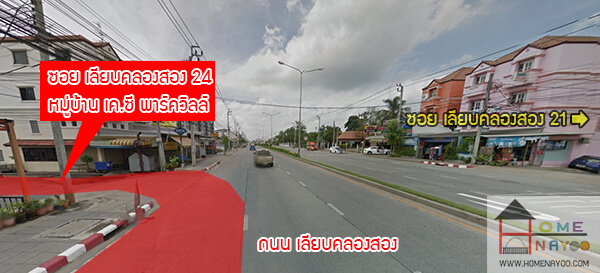 หลังจากที่กลับรถมาแล้วให้เลีย้ยวซ้ายเข้าสู่ ซอยเลียบคลองสอง 24, หมู่บ้านเค.ซี. พาร์ควิลล์