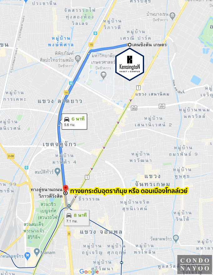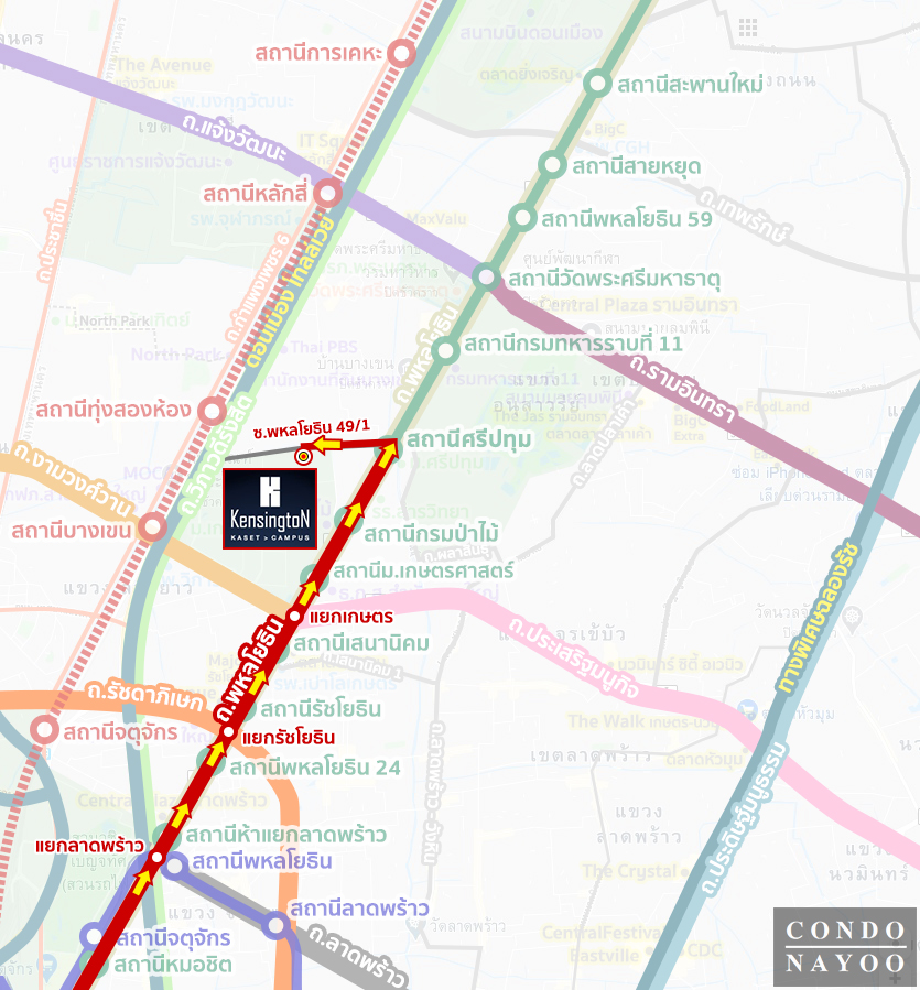 การเดินทางเริ่มจาก แยกรัชโยธิน ถนนพหลโยธิน ⇒ สถานีรัชโยธิน ⇒ สถานีเสนานิคม ⇒ สถานี ม.เกษตรฯ ⇒ สถานีกรมป่าไม้ ⇒ สถานีศรีปทุม ⇒ เลี้ยวเข้าซอยพหลโยธิน 49/1 ขับตรงไปอีก 950 ม.ถึงโครงการ Kensington Kaset Campus