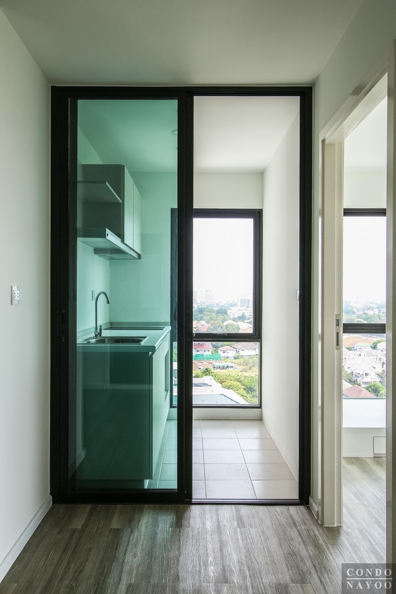 ในส่วนของห้องครัวได้เป็นครัวปิดนะคะ แยกส่วนด้วยประตูกระจกบานเลื่อน กรอบอลูมิเนียมสีดำ ลูกฟักกระจกเขียวตัดแสง
