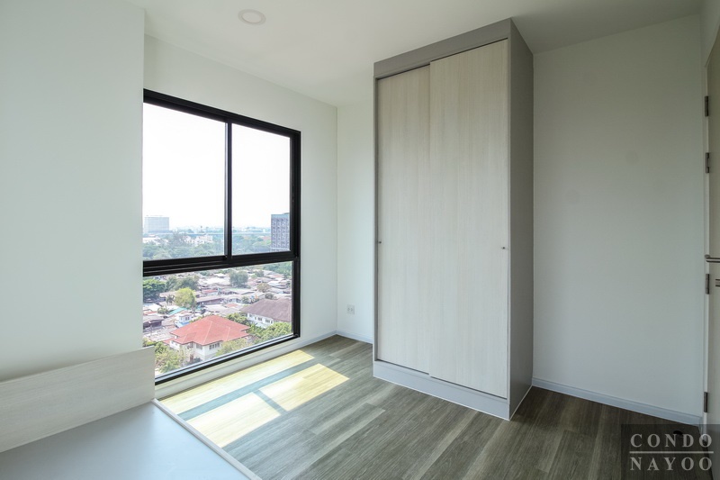 ห้องนอนรองได้วิวเมือง 2 ด้าน พร้อมเตียงนอน 3.5 ฟุต, ตู้เสื้อผ้า Built-in ขนาดมาตรฐาน และ เครื่องปรับอากาศ 1 ตัว