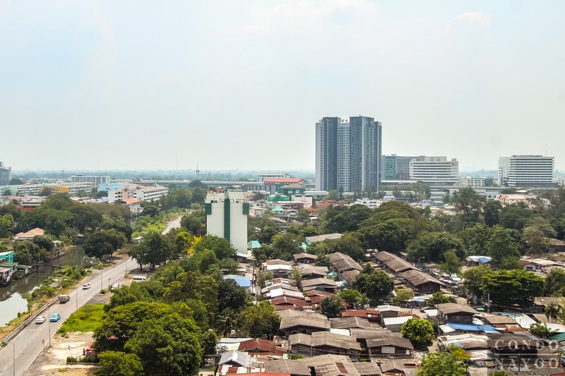 วิวจากระเบียงห้องจริง จะอยู่ทางฝั่งทิศตะวันออก มองออกมาเห็นบ้านเรือนแนวราบ ถัดออกไปเป็นวิวเมืองฝั่งพหลโยธิน และ แนวรถไฟฟ้าสายสีเขียวค่ะ