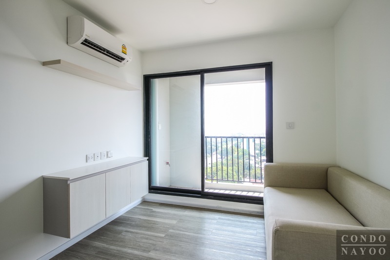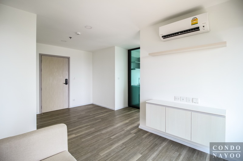 ห้องนั่งเล่นจะได้โซฟาผ้า ขนาด 2-3 ที่นั่ง พร้อมชั้นวางทีวี และ ชั้นวางของ Built-in และ เครื่องปรับอากาศ Wall Type 1 ตัว