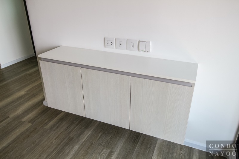 มองกลับมาดูภาพรวมฝั่งหน้าห้อง ติดกับประตูห้องพักจะเหมาะสำหรับทำเป็นมุมทานอาหาร ขนาด 2-3 ที่นั่ง หรือ จะปรับฟังก์ชันเป็นมุมทำงาน ขนาด 1-2 ที่นั่ง หรือ วางเป็นตู้เก็บของ, ตู้เก็บรองเท้า, ชั้นวางของแนวสูงก็ทำได้ค่ะ