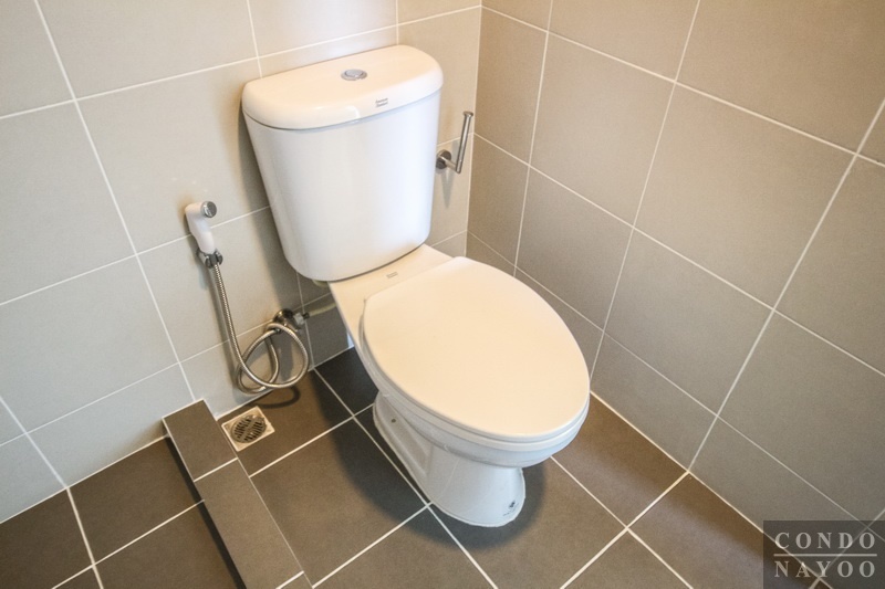 อีกฝั่งเป็นตำแหน่งของโถสุขภัณฑ์ แบบ 2 Piece ระบบ Dual Flush พร้อมอุปกรณ์ประกอบสายฉีดชำระ และ ที่แขวนทิชชู่สแตนเลส ใช้เป็นของ American Standard ทั้งหมดค่ะ