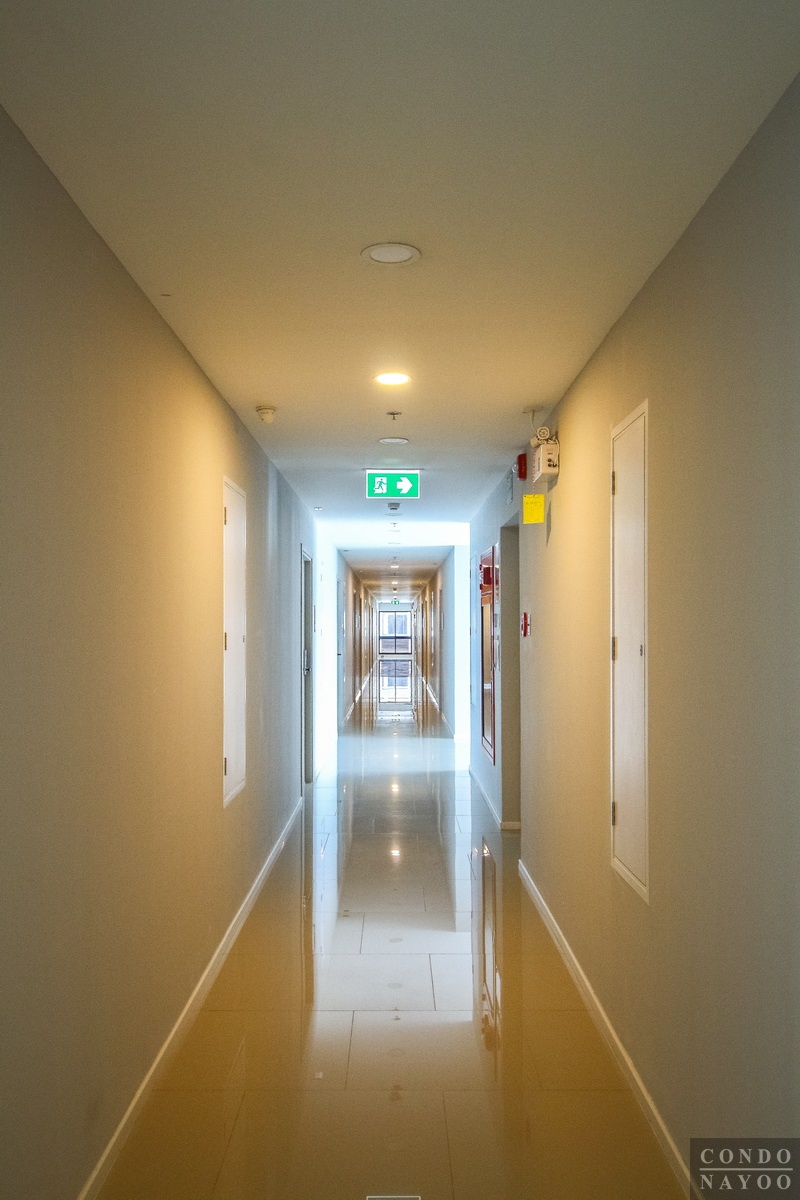 โถงทางเดินชั้นพักอาศัยปูด้วยกระเบื้องแกรนิตโต้สีครีม ความกว้างโถง ประมาณ 1.8 เมตร เพดานติดไฟดาวน์ไลท์ให้แสงสว่างตลอดโถงทางเดิน