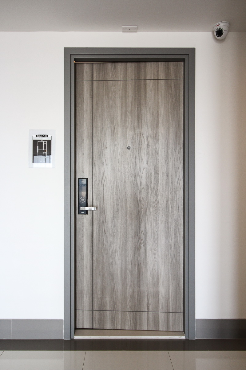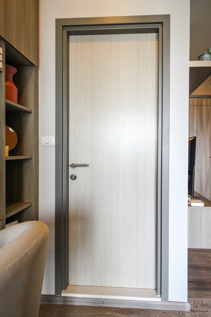 ประตูบาน HDF ปิดผิวลายไม้สี Grey Oak พร้อมตาแมว ธรณีหินสังเคราะห์สีขาว พร้อมกลอนประตู Digital Door Lock 3 ระบบ ของ Samsung