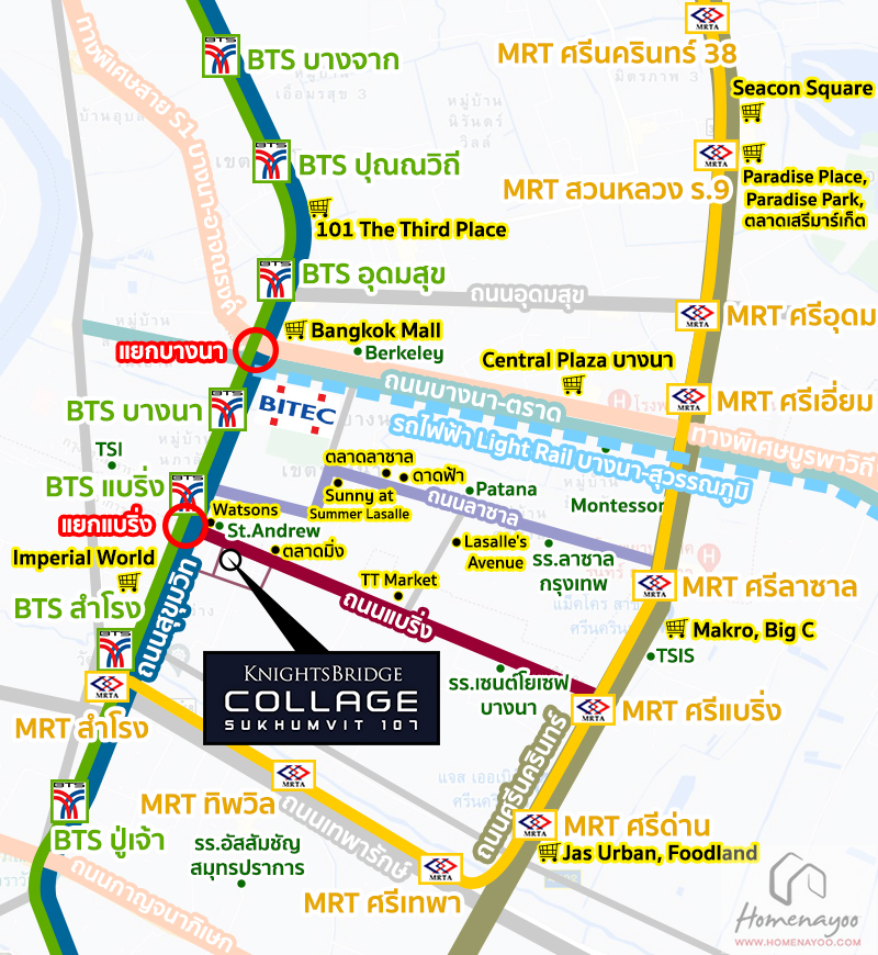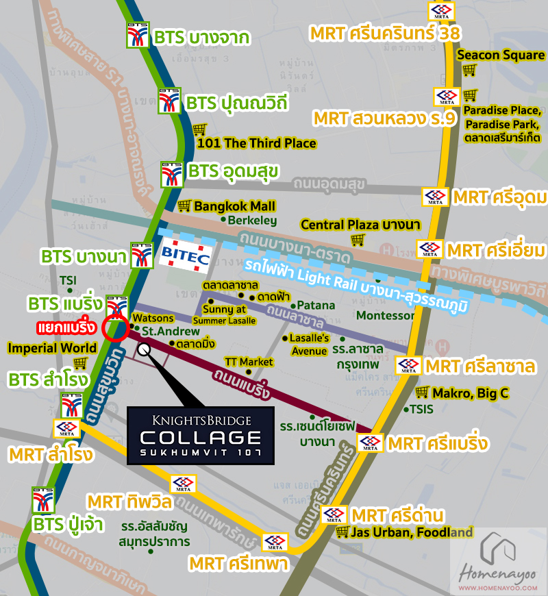 ทำเลที่ตั้งโครงการ KnightsBridge Collage สุขุมวิท 107 ตั้งอยู่ในซอยสุขุมวิท 107 หรือที่เราเรียกกันอย่างคุ้นหูว่าซอยแบริ่งค่ะ ซึ่งตัวโครงการนั้นจะอยู่ในช่วงต้นซอยติดกับซอยแบริ่ง 4 วัดจากจุดขึ้นรถไฟฟ้า BTS สถานีแบริ่ง เข้ามาประมาณ 450 เมตรเท่านั้น*