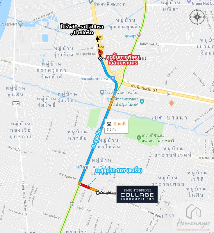 ภาพประกอบการเดินทาง เราใช้ทางพิเศษสาย S1 บางนา-อาจณรงค์ มุ่งหน้าไปสมุทรปราการ ตามทางออก 17 B โครงการนี้จอยู่ติดถนนสุขุมวิท 107 หรือ ถนนแบริ่งค่ะ