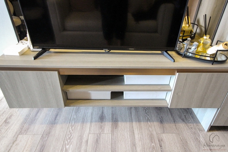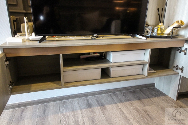 ถัดมาจะเป็นชั้นวางทีวี พร้อมตู้เก็บของบานเปิด และชั้นวางของด้านล่างแบบนี้ หน้าตู้จะวางทีวีขนาด 32-52 นิ้วได้ กำลังดี ด้านหลังเดินงานระบบไฟฟ้ามาให้พร้อมเสียบต่อใช้งาน ส่วนด้านล่างตู้จะมีพื้นที่ว่าง ให้เราวางพวกกล่องรองเท้า หรือกล่องเก็บของใบเล็ก ๆ ได้