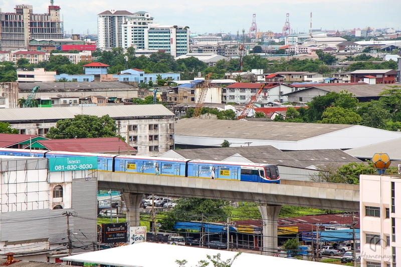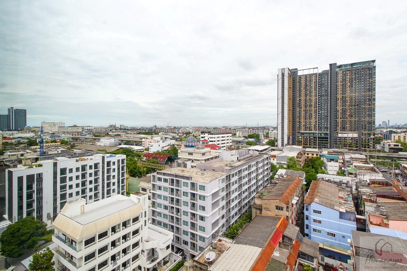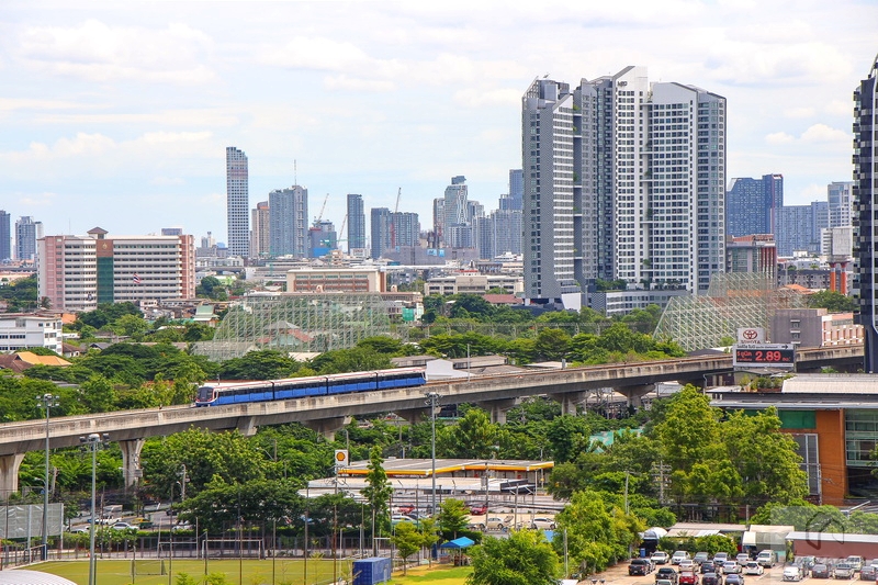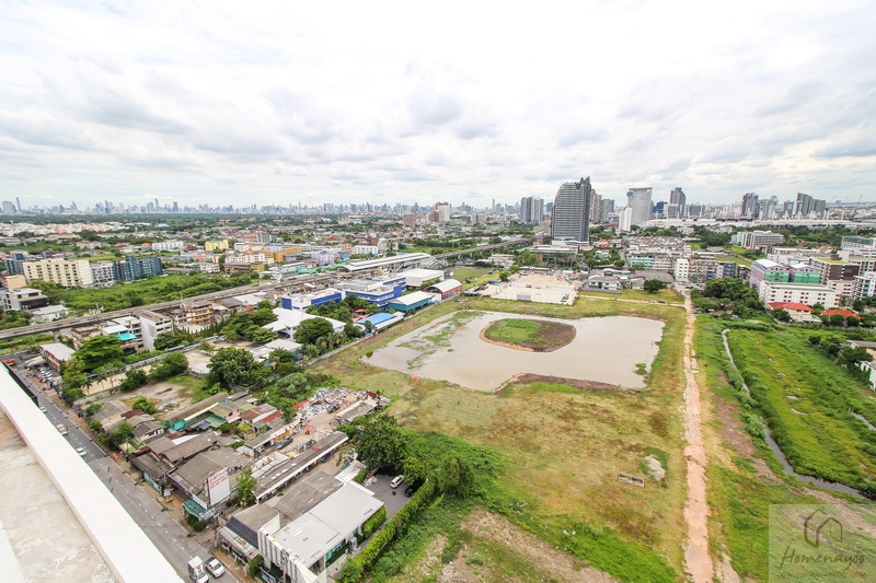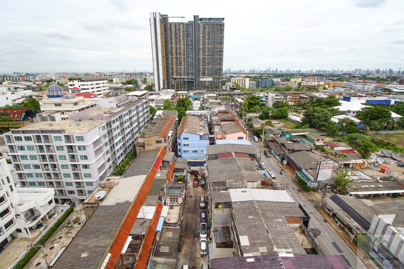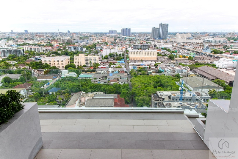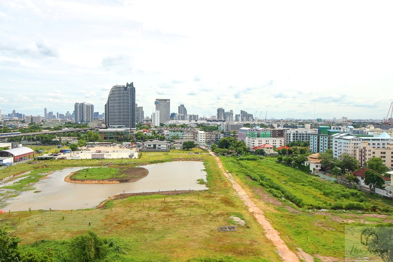 มองออกมาจะเห็นวิวเมืองฝั่งบางนา เห็นที่ดินเปล่าที่เป็นพื้นที่สีเขียวกว้าง ๆ และมองเห็นแนวรถไฟฟ้าสายสีเขียวด้วย
