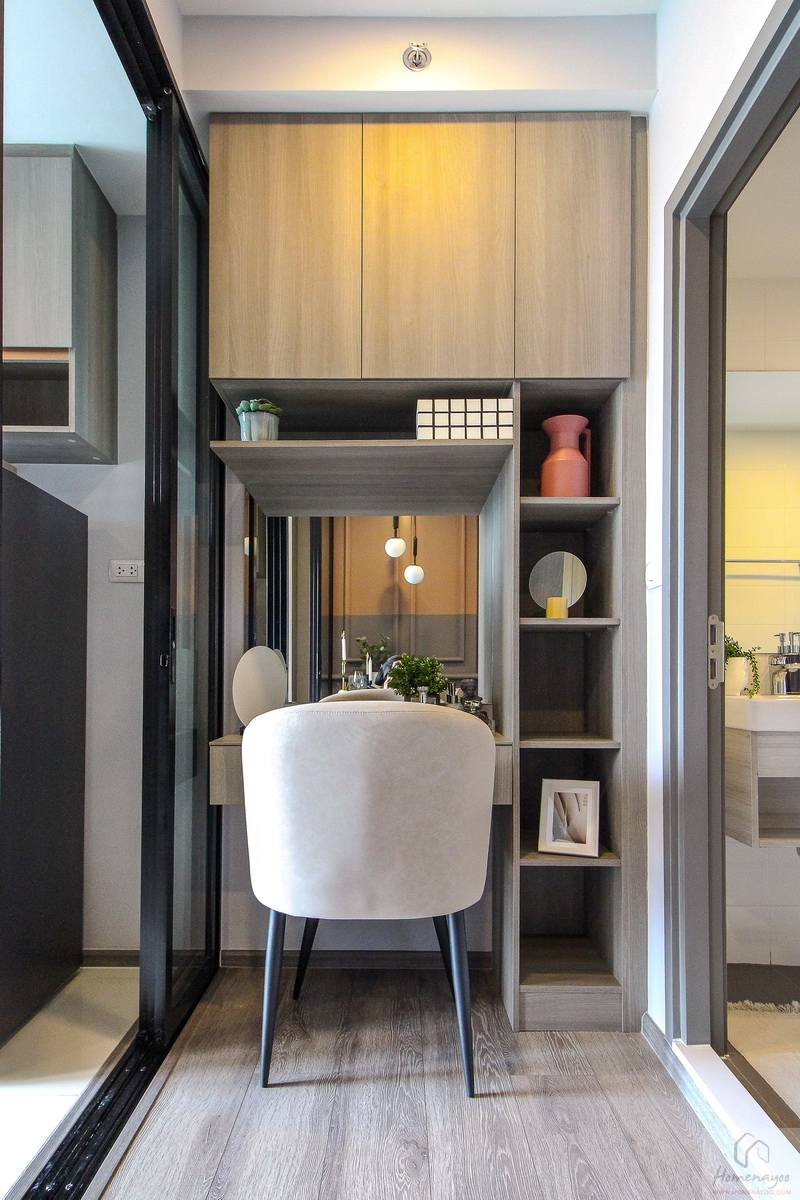 มุมทำงานจะได้เฟอร์นิเจอร์บิวท์อินลายไม้ Full Set ตามนี้เลยค่ะ คือจะมีทั้งโต๊ะแบบ Multi-Function ที่ใช้เป็นโต๊ะทำงาน หรือ โต๊ะเครื่องแป้งก็ได้ ผนังติดกระจกเงาให้ด้วย 1 บาน ส่วนชั้นวางของ และตู้เก็บของมีให้หลายจุด ทำให้เก็บของจุกจิกได้เยอะพอสมควร