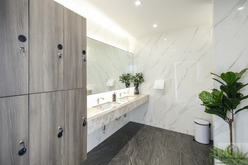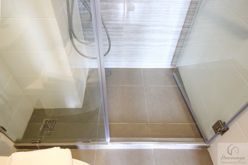 ฝั่งในสุดของห้องเป็นโซนอาบน้ำ พื้นก่อธรณีมาให้เพื่อกันน้ำไหลย้อน พร้อมติดตั้ง Shower Box ประตูบานสวิง กระจก Temper มือจับสแตนเลสตัว L แขวนผ้าเช็ดตัวได้ให้ตามนี้