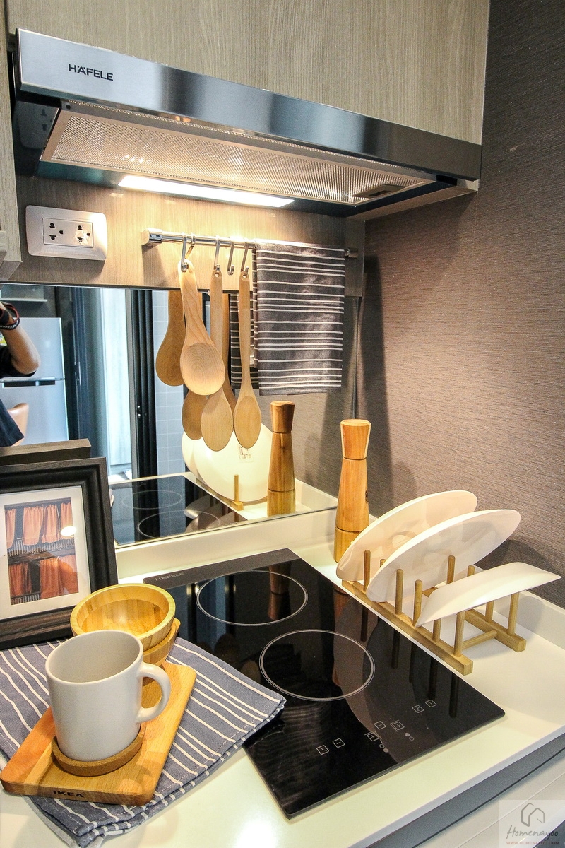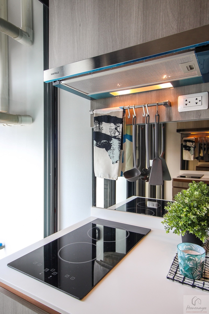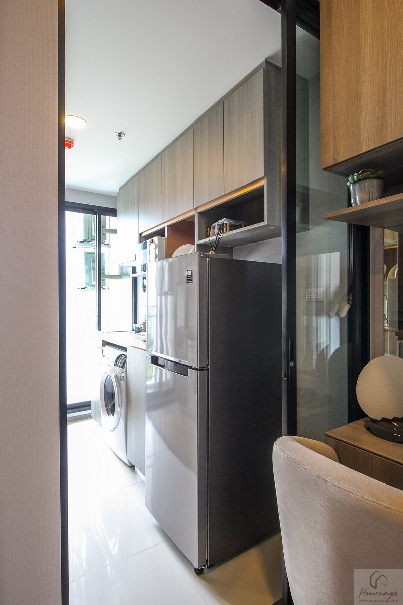 ห้องครัวขนาดค่อนข้างกระชับ เป็นห้องหน้าแคบแต่ลึก พื้นที่เชื่อมต่อกัยระเบียงด้านนอกได้ ในห้องนี้จะได้ชุดครัวบิวท์อิน และมีพื้นที่เหลือให้วางตู้เย็น ขนาด 6-8 คิวได้