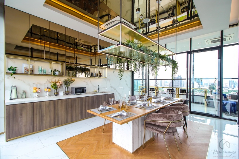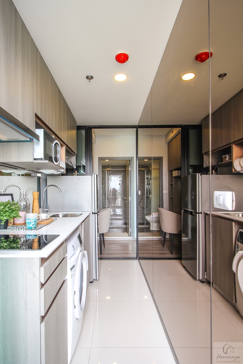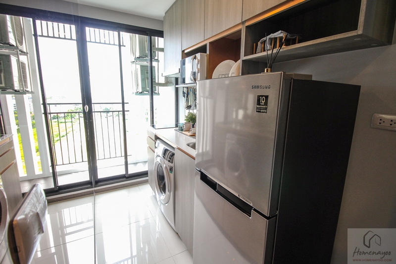 ไปดูอีกฝั่งของห้องกันบ้าง โถงตรงกลางจะเป็นครัวเปิด ที่ได้ Spec ของมาเหมือนกันกับห้องก่อนหน้านี้ ยกเว้นเพียงขนาดที่มีความกว้างลดลงมา ส่วนซ้ายมือจะเป็นห้องน้ำ ขวามือเป็นอเนกประสงค์ ที่เชื่อมต่อระเบียงด้านนอกได้