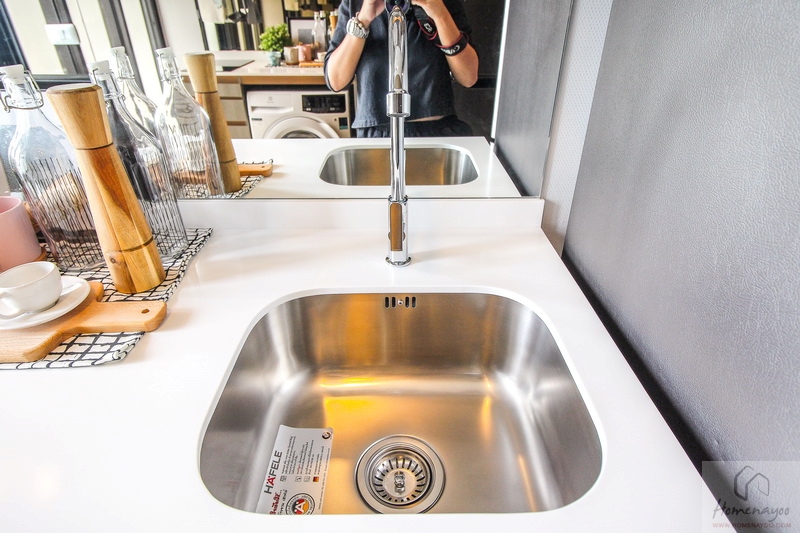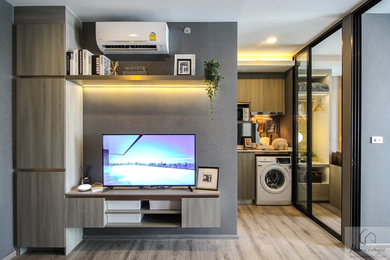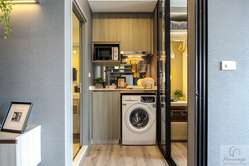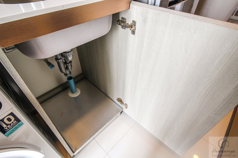 ด้านล่างจะมีช่องวางเครื่องซักผ้าฝาหน้า ขนาด 7 กก. ด้านหลังเดินงานระบบประปา-ระบบไฟฟ้ามาให้พร้อมต่อใช้งาน ส่วนที่เหลือจะเป็นตู้เก็บของ และลิ้นชักเก็บของ