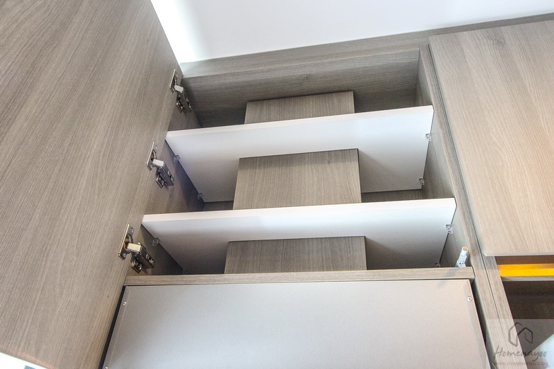 ด้านหลังประตูทางเข้าจะได้เป็นตู้เก็บของบานเปิด ที่บิวท์มาให้สูงจรดฝ้าเพดานเลยค่ะ นอกจากนั้นยังแบ่งฟังก์ชันออกมาให้อีก 3 ตู้ โดยชิ้นล่างสุดจะเป็นตู้เก็บรองเท้า พร้อมชั้นลาดเอียงสำหรับวางรองเท้าที่ด้านใน และมีช่องระบายอากาศ ลดความอับชื้น ป้องกันการเกิดเชื้อรามาให้ด้วย