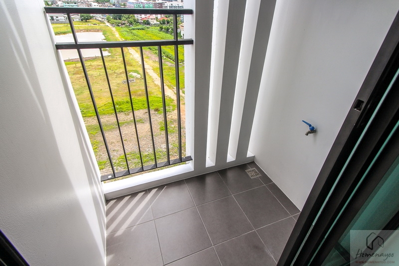 ประตูระเบียงจะเป็นบานเลื่อน 3 ตอน พื้นระเบียงปูกระเบื้องเซรามิกกันลื่น 30 x 30 ซม. เจาะท่อระบายน้ำทิ้งให้เรียบร้อย ผนังขวามือมีก๊อกสนามให้ 1 จุด ไว้ให้สำหรับล้างพื้น หรือ รดน้ำต้นไม้ได้