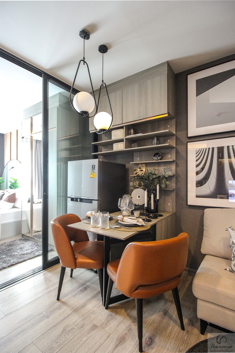 ห้องนั่งเล่นจะรวมพื้นที่พักผ่อน และมุมทานอาหารเข้าไว้ด้วยกันแบบนี้ สามารถวางโซฟา 2 ที่นั่ง ด้านหน้ามีพื้นที่เหลือพอให้วางโต๊ะกลางขนาดกะทัดรัดเพิ่มเข้าไปได้