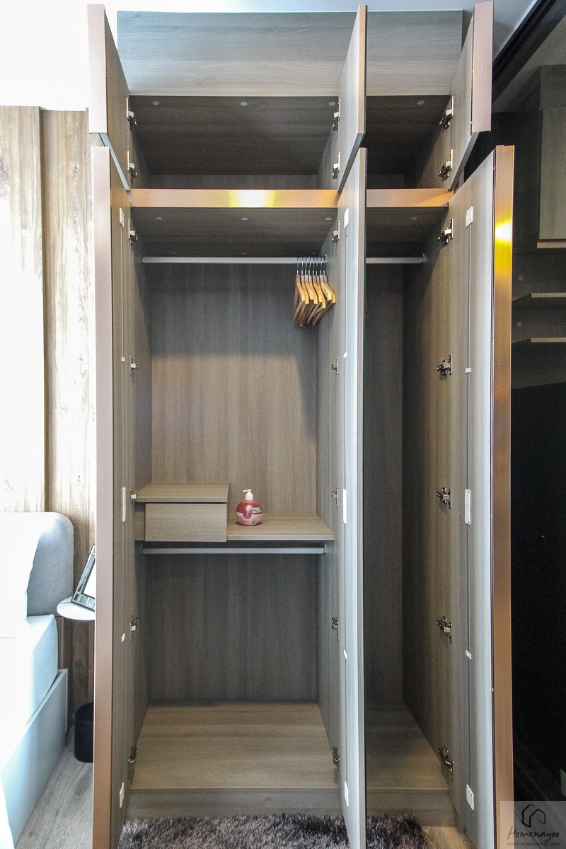 ตู้เสื้อผ้าบิวท์อินความสูงจรดฝ้าเพดาน เก็บของได้เยอะ และไม่ต้องกลัวเรื่องฝุ่นบนหลังตู้ ที่เราจะเช็ดกันไม่ถึง โครงการให้เป็นตู้บานเปิด หน้าบานกระจกเงาเต็มบานส่องได้เต็มตัว โดยจะแบ่งไว้ให้ 2 ตู้ ส่วนภายในได้ฟังก์ชันการใช้งานมาให้ครบ ทั้งราวแขวนผ้าบน-ล่าง, ชั้นวางของ และลิ้นชักเก็บของ