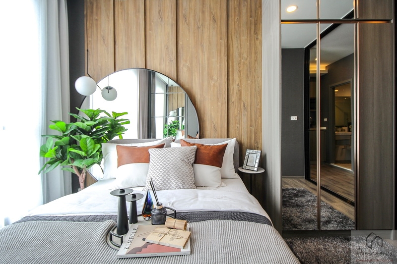 เข้ามาด้านในห้องนอนตัวพื้นจะปูลามิเนตลายไม้สี Grey Oak หนา 12 มม. ต่อเนื่องมาจากด้านนอก ส่วนเฟอร์นิเจอร์มาตรฐานที่ได้มากับตัวห้องก็จะมีฐานเตียงนอน 5 ฟุต, ตู้เสื้อผ้า และ แอร์ Wall Type