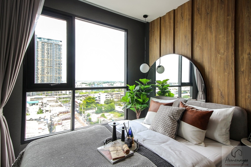 ในห้องนอนจะได้หน้าต่างบานกระทุ้งและบานฟิกซ์ ลูกฟักกระจกเขียวตัดแสง กรอบอะลูมิเนียมสีดำ นอกจากนี้เรายังจะได้ผ้าม่านแถมมากับตัวห้องด้วยนะคะ (แต่จะเป็นสีมาตรฐานของทางโครงการ) โดยเราสามารถเปิด-ปิดม่านผ่านระบบ Home Automation ได้อีกด้วย