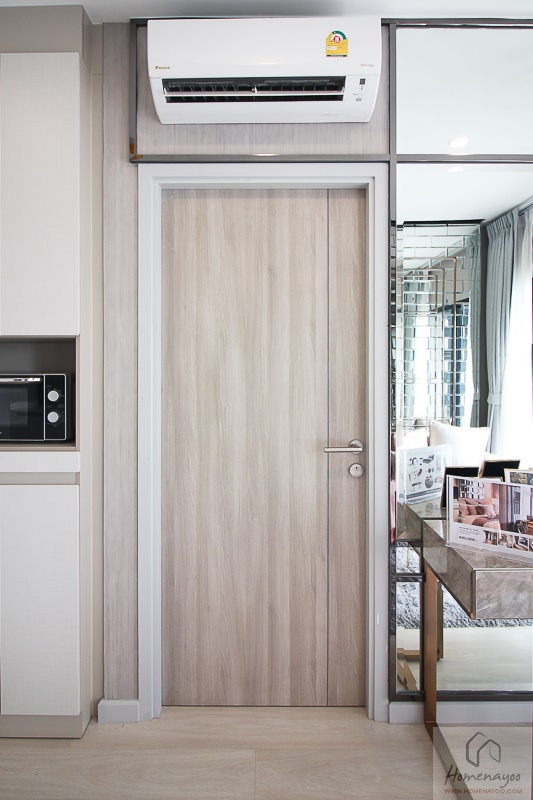 ประตูห้อง เป็นไม้สำเร็จรูปลายไม้สีอ่อน พร้อมตาแมว วงกบประตูเป็นไม้เนื้อแข็งทาสีขาว ติดกลอนประตู Digital Door Lock 3 ระบบ ของ Samsung