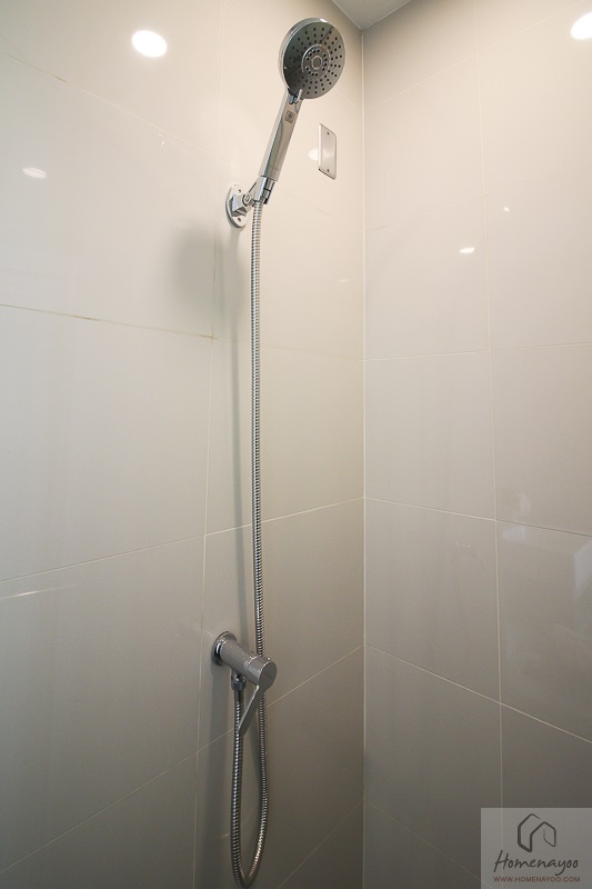 ด้านในติดฝักบัวแบบ Hand Shower ให้แบบนี้ค่ะ ที่หัวฝักบัวมีฟังก์ชั่นสามารถปรับรูปแบบของสายน้ำได้