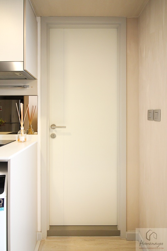 เริ่มจากประตูห้อง เป็นไม้สำเร็จรูปลายไม้สีอ่อน พร้อมตาแมว วงกบประตูเป็นไม้เนื้อแข็งทาสีขาว