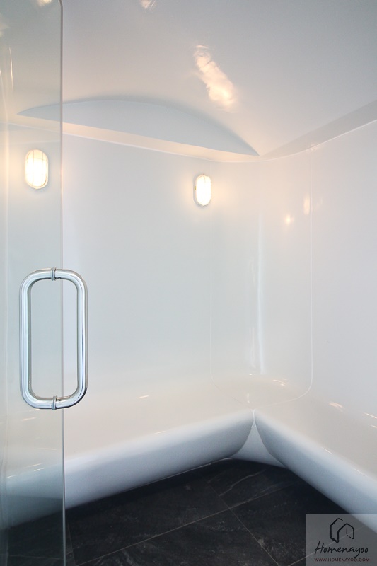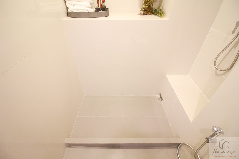 ส่วนโซนเปียกก็จะมีช่องตรงผนังสำหรับวางของใช้ และก่อม้านั่งสำหรับนั่งอาบน้ำได้
