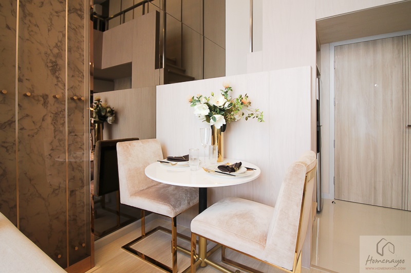 มุมรับประทานอาหารนั้นสามารถวางชุดโต๊ะรับประทานอาหารพร้อมเก้าอี้ขนาด 2 ที่นั่งได้ตามแบบนี้เลย หรือจะเลือกวางโต๊ะยาวชิดผนังก็ได้