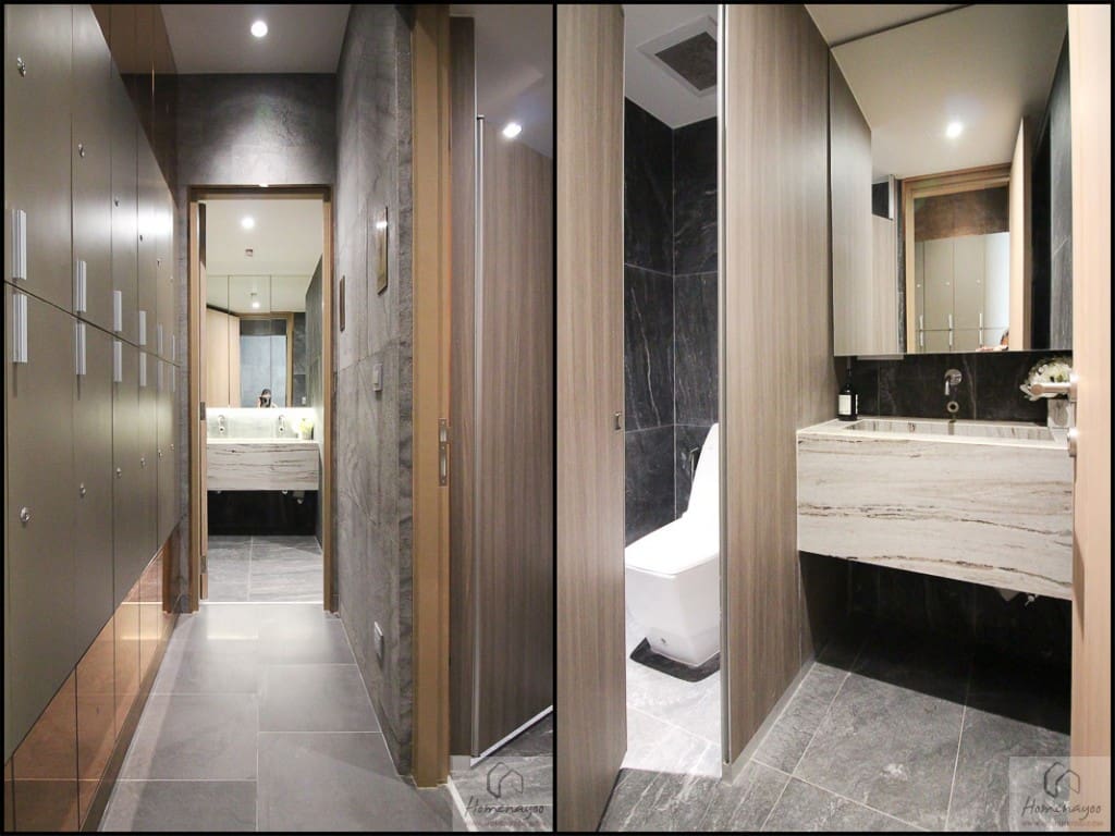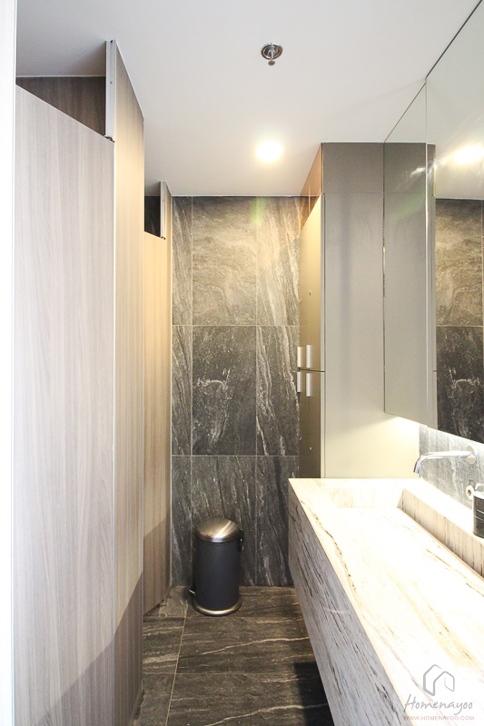 ระหว่างทางนี้ ฝั่งขวามือจะมีพื้นที่ตู้ล็อคเกอร์และห้องน้ำแยกชาย-หญิง ให้ สำหรับการใช้งานในส่วนของ Sky Lounge, Fitness Mezzanine และ Media Club
