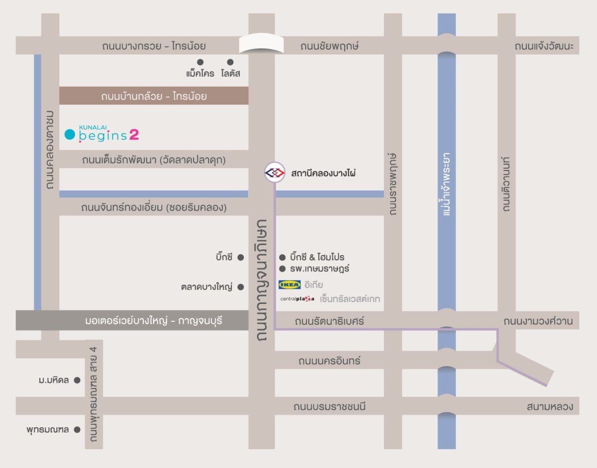 ทำเลที่ตั้ง : โครงการ Kunalai Begins 2 ตั้งอยู่บนถนนเลียบคลองตาชม เพียง 700 ม.* จากถนนบ้านกล้วย-ไทรน้อย ซึ่งเป็นทำเลโซนบางบัวทอง-นนทบุรี ที่มีความเป็นชุมชนสูง มีความคึกคัก และมีความอุดมสมบูรณ์โดยรอบ ถ้ามองภาพรวมของทำเล จะเกาะความอุดมสมบูรณ์ทางฝั่งตะวันตกของกรุงเทพฯ ที่มีสิ่งอำนวยความสะดวกรองรับอย่างครบครัน โดยเฉพาะตรงจุดตัดถนนกาญจนาภิเษกที่แยกบางใหญ่ เพราะมีการตัดผ่านของรถไฟฟ้าสายสีม่วง จึงเป็นทำเลที่มีการพัฒนาและมี Demand ของที่อยู่อาศัยอย่างต่อเนื่อง