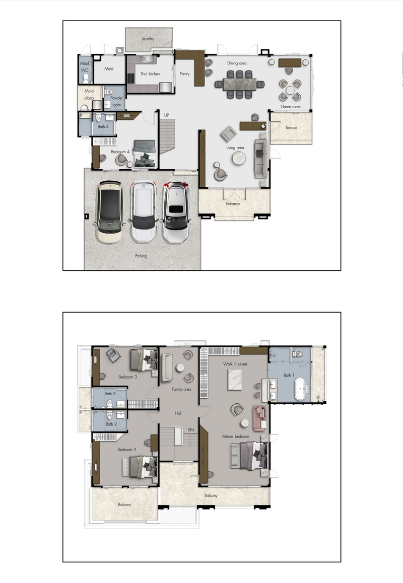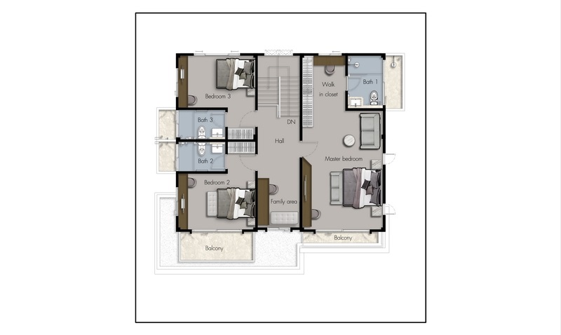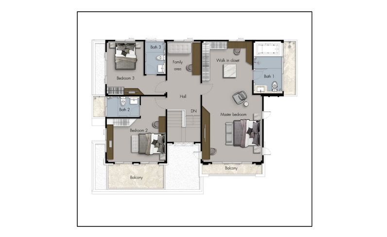 ฟังก์ชันชั้นนี้ประกอบด้วย 3 ห้องนอน พร้อมห้องน้ำในตัวทุกห้อง และมี Family Area ตรงโถงกลางชั้น 2