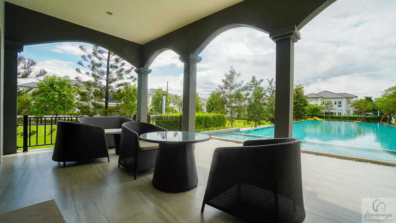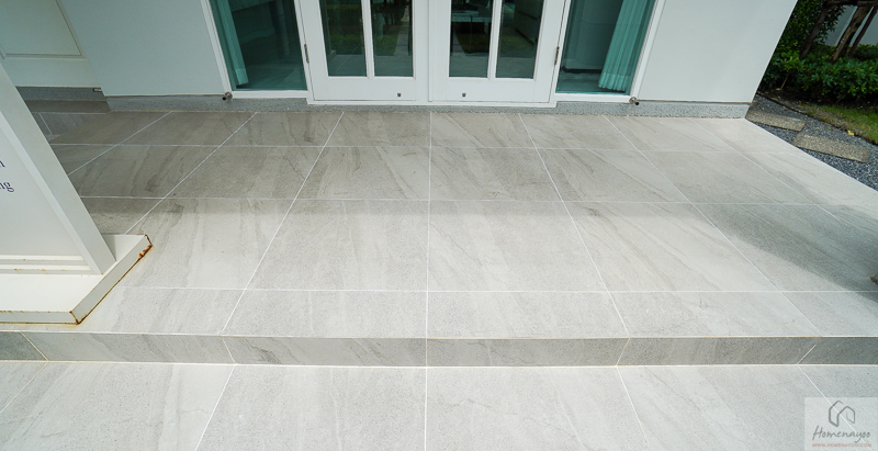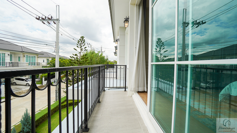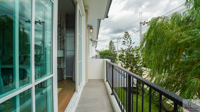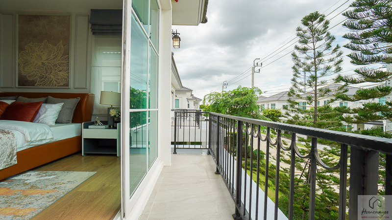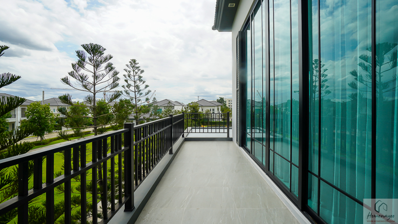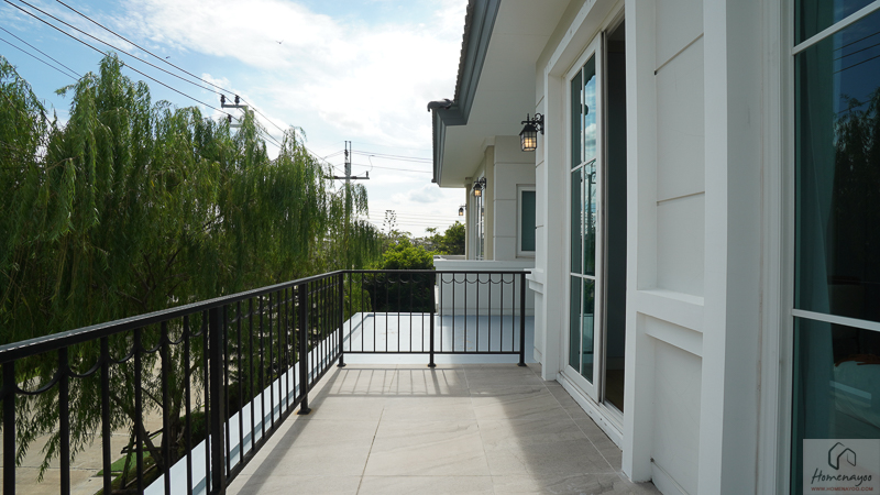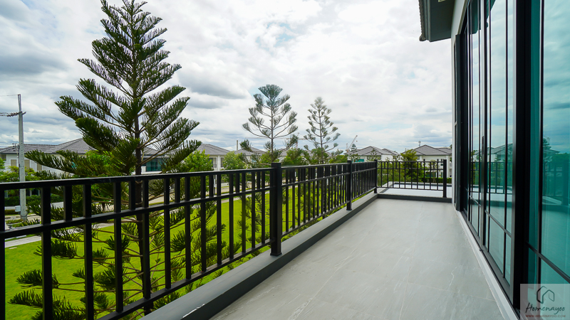 ด้านนอกจะได้เป็นระเบียงขนาดใหญ่พิเศษ ปูพื้นด้วยกระเบื้องและติดตั้งราวกันตกมาให้เรียบร้อย พื้นที่ใช้งานกว้างพอสำหรับวางชุดโต๊ะน้ำชา 2-3 ที่นั่ง เหมาะสำหรับออกไปนั่งเล่นรับลม หรือนั่งอ่านหนังสือชิล ๆ ในตอนเย็น เติมบรรยากาศพักผ่อนให้กับบ้านได้อย่างลงตัว