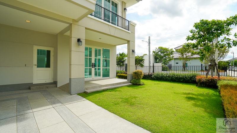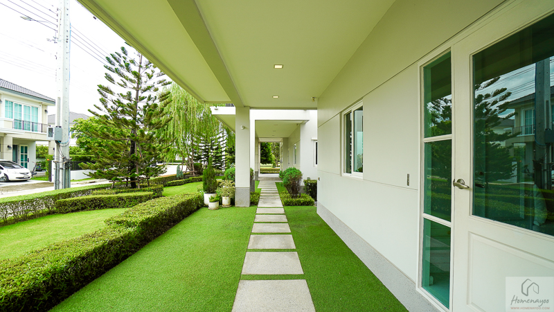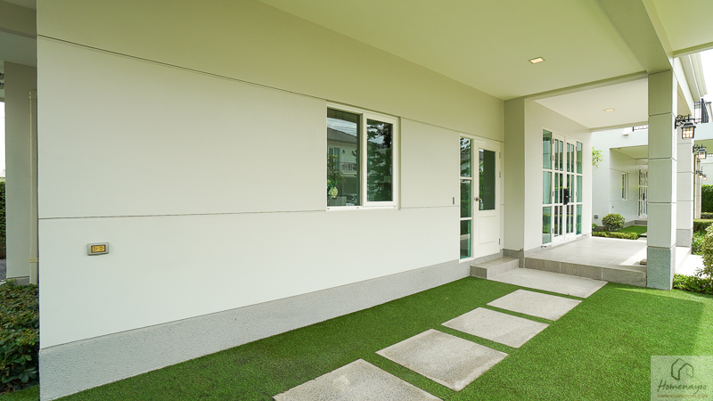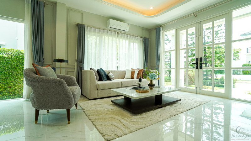 ตัวบ้านออกแบบหน้ากว้าง เพดานสูง 2.7 ม. ช่องแสงรอบด้านช่วยดึงแสงธรรมชาติเข้ามาเพิ่มความโปร่งโล่ง วัสดุที่ได้จัดเต็มสมราคา ทั้งอิฐมวลเบา Q.CON ที่ช่วยลดความร้อนและต่อเติมได้ในอนาคต, พื้นแกรนิตโต้ลายหินอ่อน 80×80 ซม. ที่ดูหรูหรา, ประตูหน้าต่างกรอบ UPVC ของ Windsor, สุขภัณฑ์ American Standard และไฟ LED ทั้งหลัง