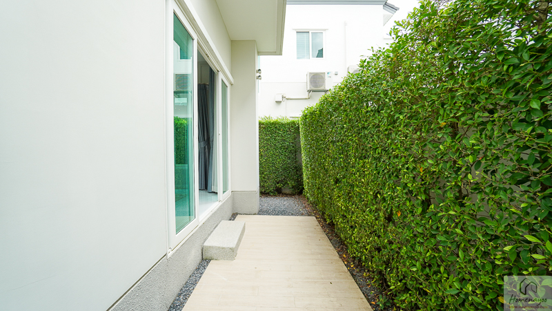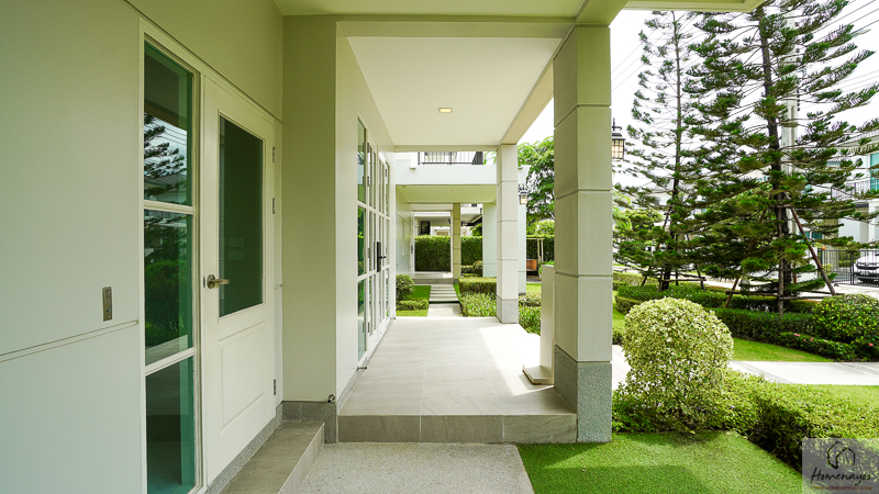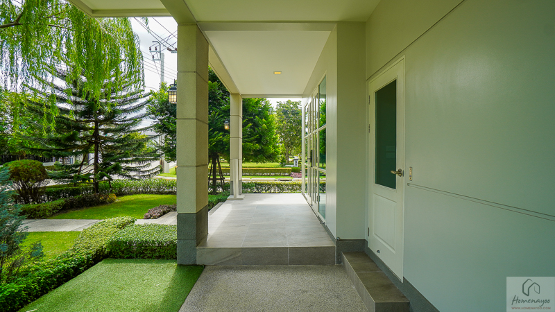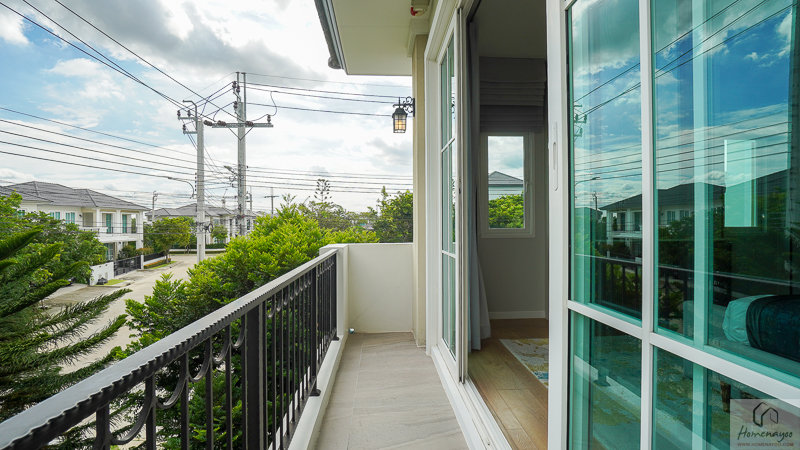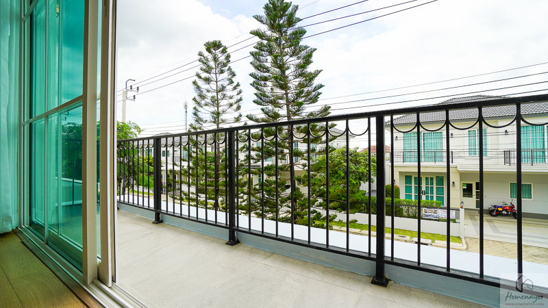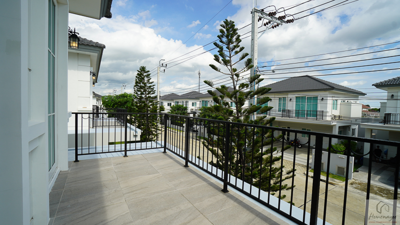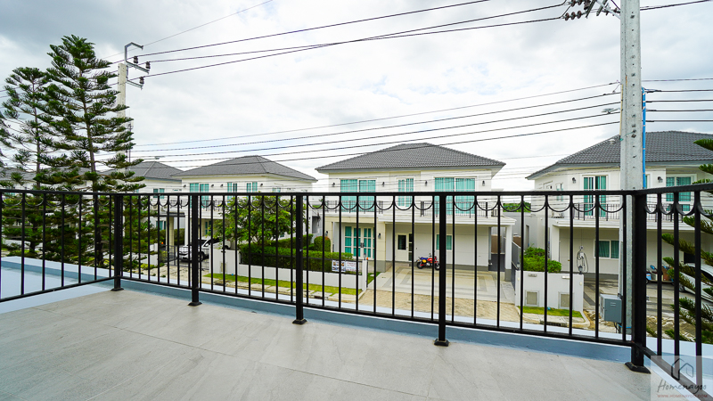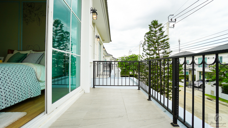 ด้านหน้าจะเป็นระเบียงหน้ากว้าง ปูพื้นกระเบื้องมาให้เต็มพื้นที่และติดราวกันตกเหล็กดัดสีดำมาให้เรียบร้อย สามารถใช้เป็นจุดยืนรับลมชมวิว หรือใช้เป็นพื้นที่สวนเล็ก ๆ ในห้องนอนได้เลย