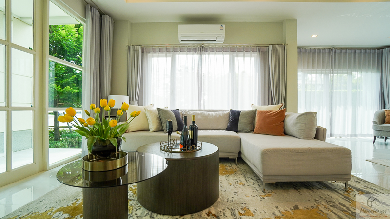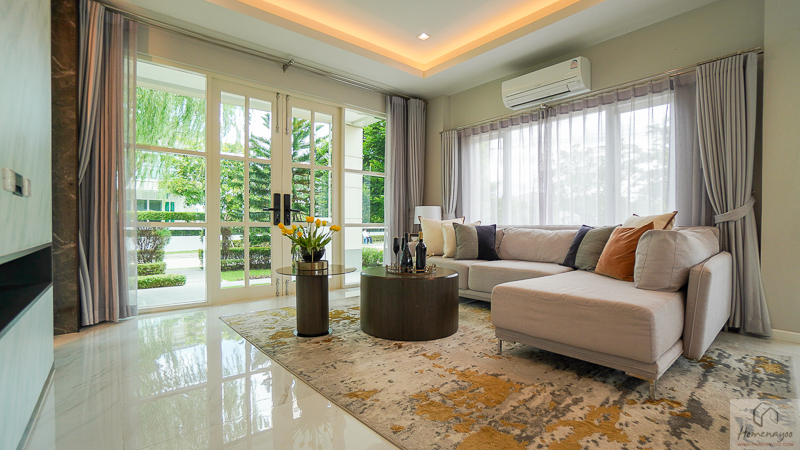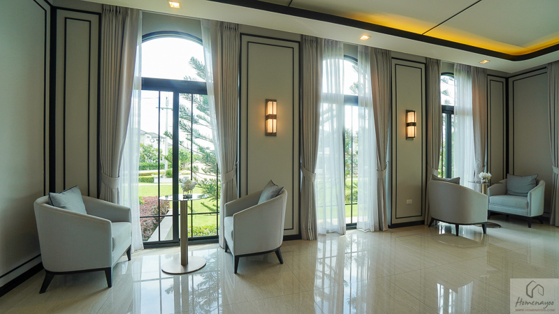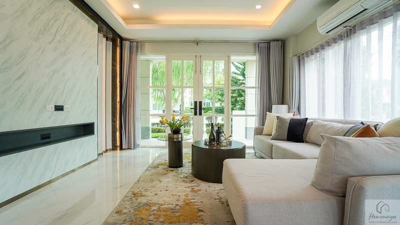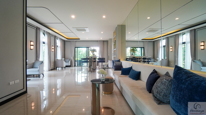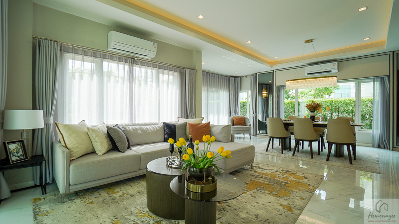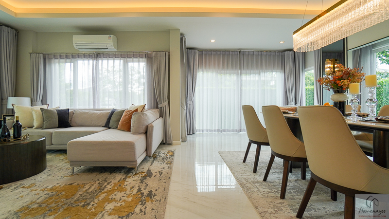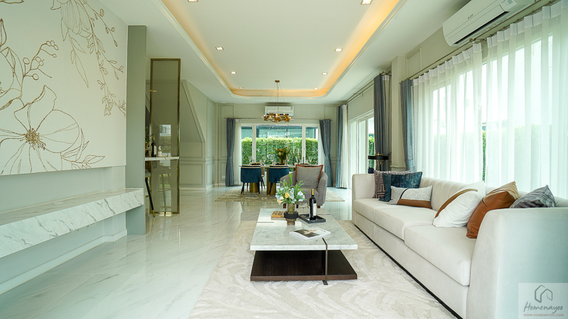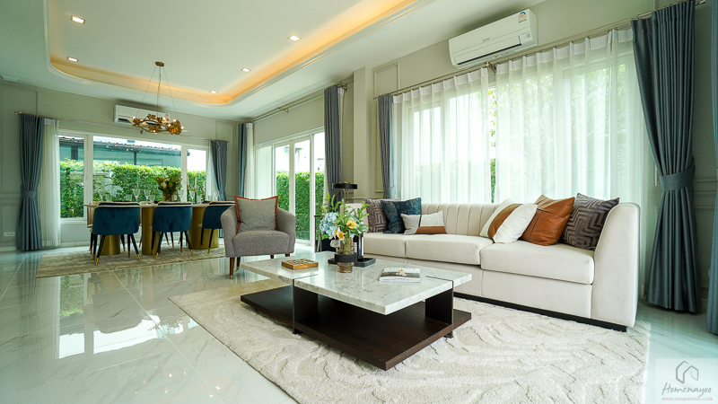 ในบ้านตัวอย่างจัดวางโซฟาเซ็ตรวม 4 ที่นั่ง พร้อมโต๊ะกลางให้เห็นระยะใช้งานจริง ส่วนบ้านจริงสามารถเลือกวางเป็น โซฟาตัวยาว 4-6 ที่นั่ง หรือจะปรับเป็น แบบ L-Shape 4-6 ที่นั่ง ก็ลงตัวค่ะ